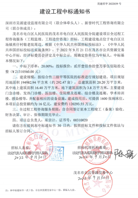 近日,星空网页版登录入口作为联合体牵头人,与新誉时代工程咨询有限公司成功中标茂名市电白区人民医院分院建设项目全过程工程咨询服务。此项目中标金额约为2131万元,由昊源监理为该项目提供工程监理服务,新誉时代为该项目提供工程造价咨询服务。