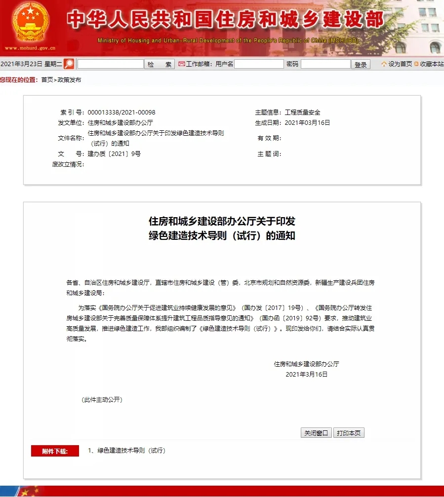 3月22日,为贯彻落实绿色发展理念、推进绿色建造、提升建筑工程品质、推动建筑业高质量发展,住房和城乡建设部组织编制了《绿色建造技术导则(试行)》,并于近日印发。