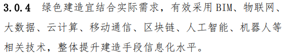 住房和城乡建设部明确,绿色建造应将绿色发展理念融入工程策划、设计、施工、交付的建造全过程,充分体现绿色化、工业化、信息化、集约化和产业化的总体特征。同时,宜结合实际需求,有效采用BIM、物联网、大数据、云计算、移动通信、区块链、人工智能、机器人等相关技术,整体提升建造手段信息化水平;宜采用工程总承包、全过程工程咨询等组织管理方式,促进设计、生产、施工深度协同,整体提升建造管理集约化水平。